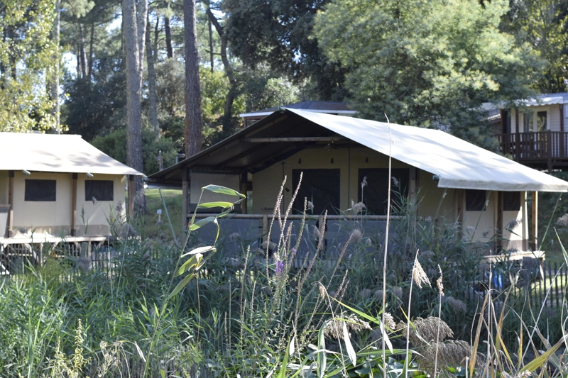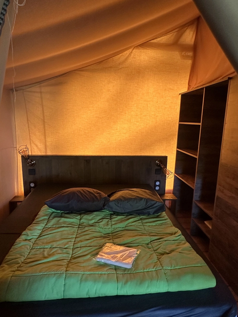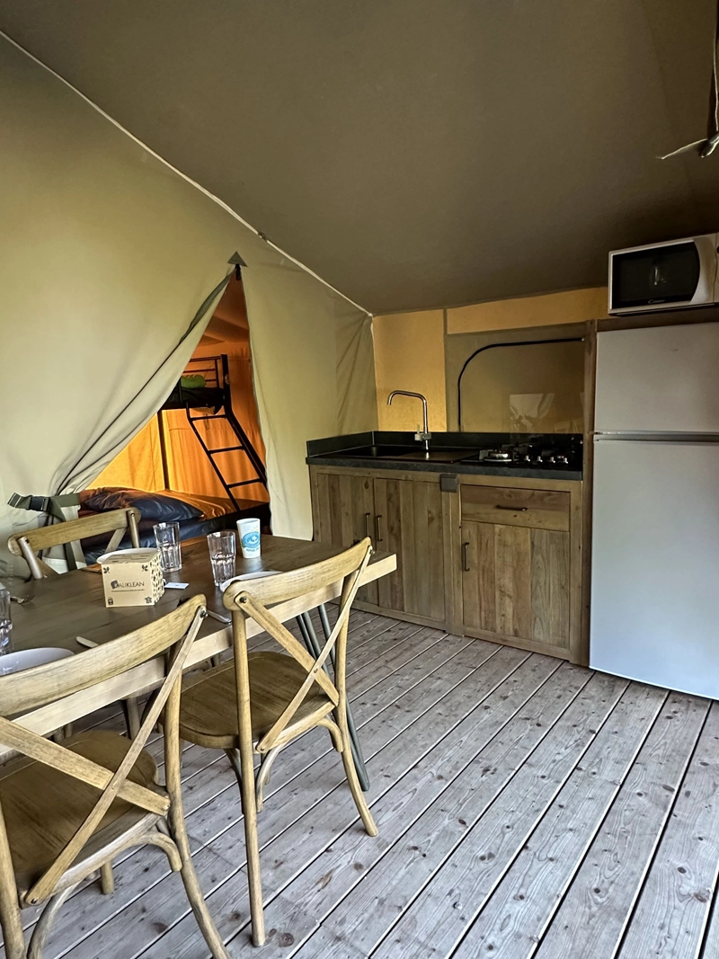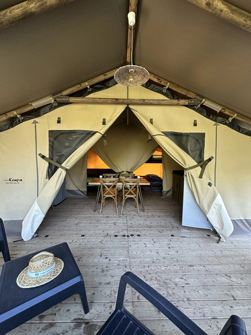 Glamping-Erlebnis im Safari-Stil. Es steht auf Stelzen und verbindet Charme und Komfort mit einer