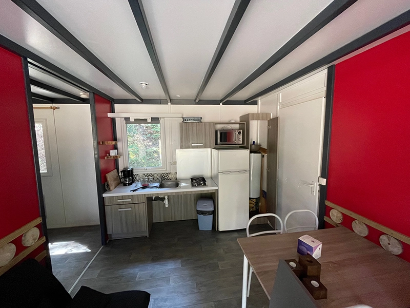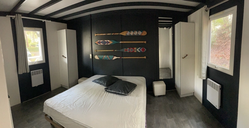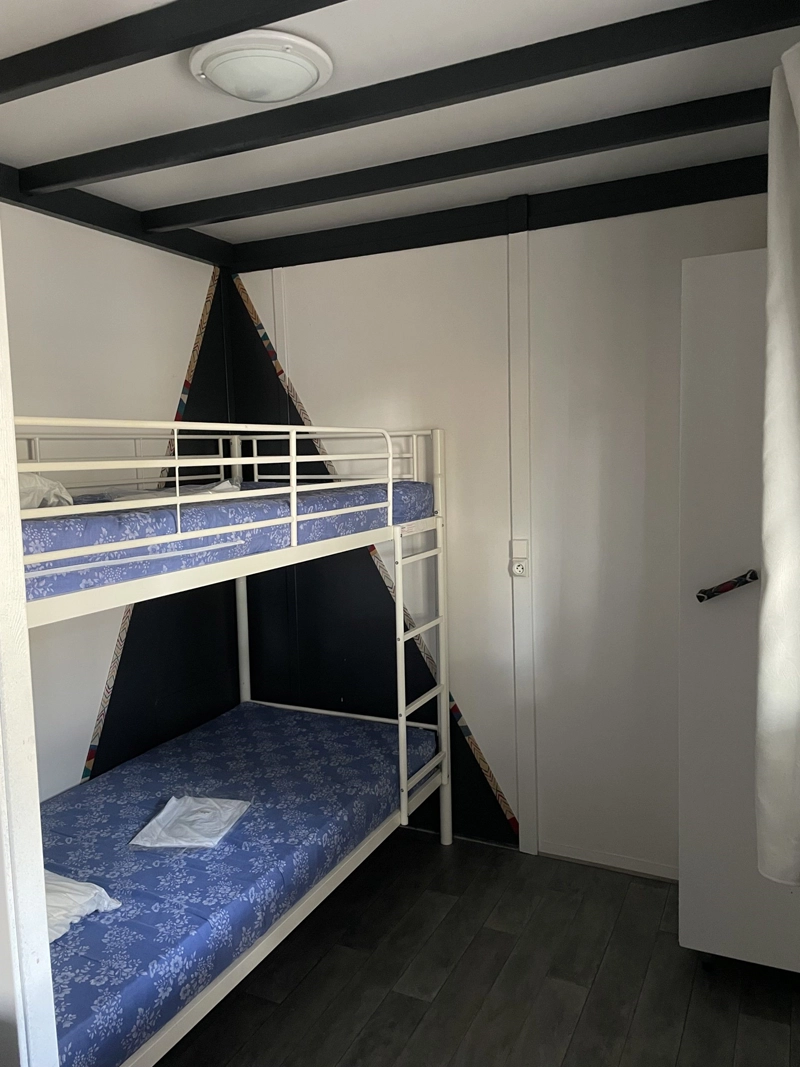Dieses Chalet wurde 2021 renoviert und war früher für Menschen mit eingeschränkter Mobilität ausgestattet. Es ist perfekt für eine vierköpfige Familie.  Im Außenbereich verläuft eine überdachte Terrasse entlang des Chalets, ideal, um die frische Luft zu genießen. Es liegt an einer bewaldeten Düne und nur 500 Meter vom Eingang entfernt und bietet eine ruhige Umgebung.