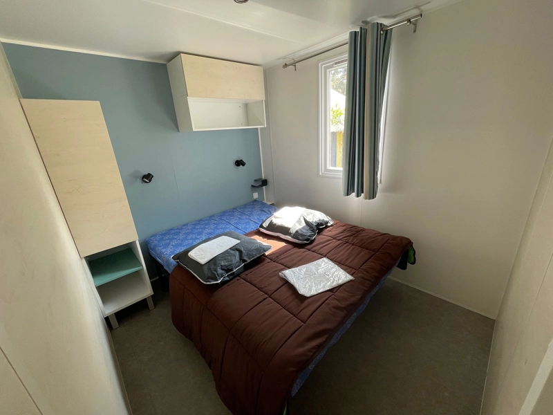 beliebteste Mietunterkunft auf dem Campingplatz. Wählen Sie zwischen schattigen oder sonnigen Stellplätzen. Genießen Sie entspannende Momente auf der überdachten Terrasse. Das Elternschlafzimmer ist vom Kinderzimmer getrennt.
